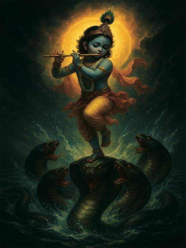 The image depicts the Hindu deity Lord Krishna in the form of the Kalinga Narthana, where he dances on the head of the multi-hooded serpent, Kaliya. This moment is a significant story in Hindu mythology, symbolizing the triumph of good over evil.