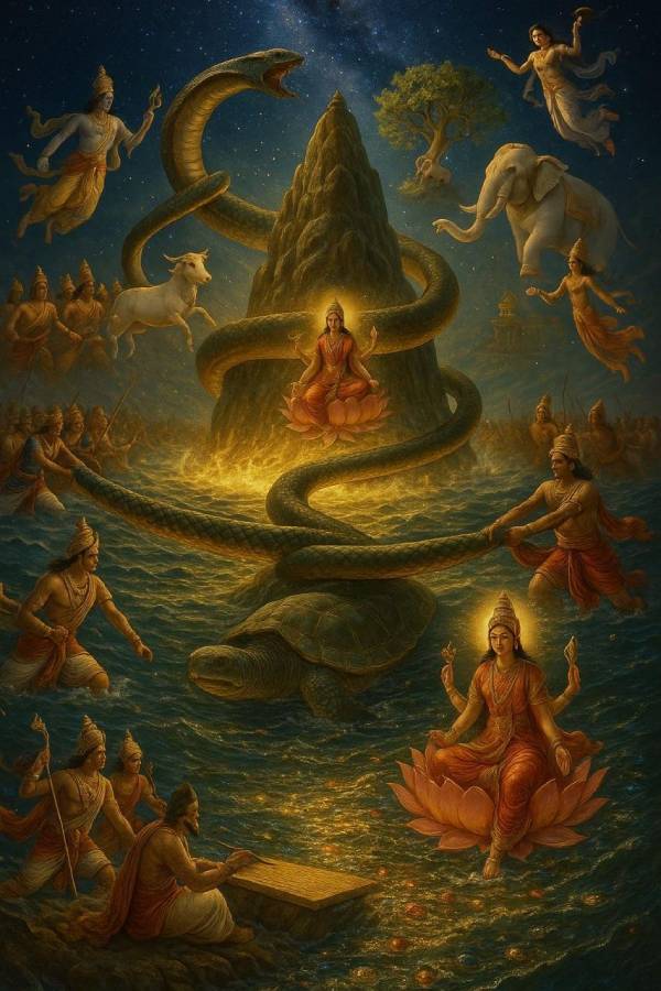 దేవతలు మరియు అసురులు సముద్రాన్ని మథనం చేశారు, అది వివిధ రకాల సంపదలను (రత్నాలను) విడుదల చేసింది.
